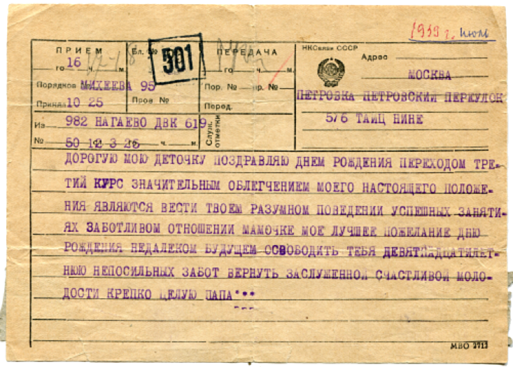 09.10.1939 г. «Я твердо верю, что в ближайшее время поеду к вам. Опасность лишь, что в связи с перерывом в навигации (с 15 декабря по 15 мая) может и не успеть проведение всех формальностей и прохождение по всем инстанциям моего вызова. Я не сомневаюсь, что в результате протеста прокурор НКВД вынесет благоприятное для меня решение…»