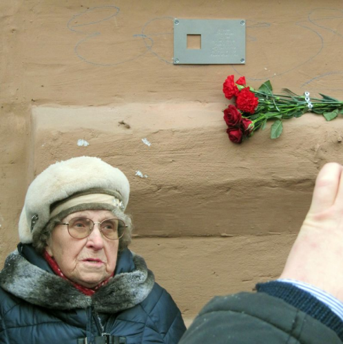– Кракат Лариса Михайловна – внучка репрессированного Краката Оскара Фёдоровича (Мытнинская ул., 7. Ему была установлена табличка 30.09.2018) пришла на установку с делом своего деда