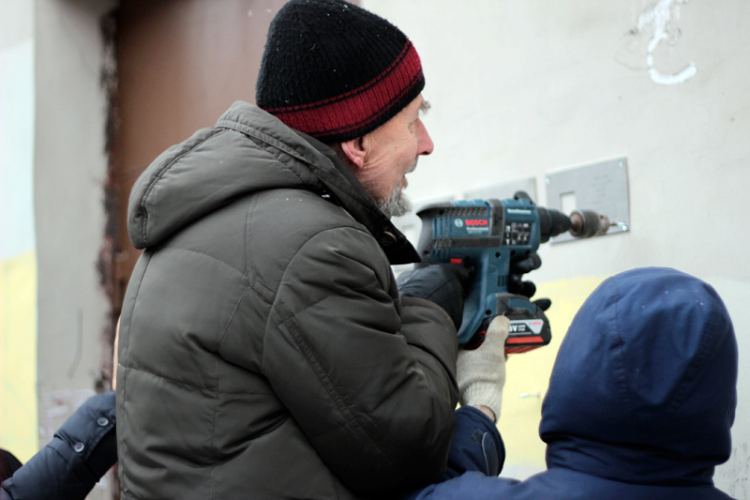 Таблички отцу и сыну Петровым устанавливают их родственники Дарья Захарова и Илья Захаров-Гезехус, приехавший на установку из Москвы.